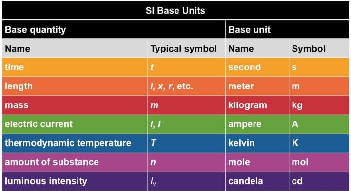 The nature of a physical quantity is described by its dimensions. All the physical quantities represented by derived units can be expressed in terms of some combination of seven fundamental or base quantities. We shall call these base quantities as the seven dimensions of the physical world, which are denoted with square brackets [ ]. Thus, length has the dimension [L], mass [M], time [T], electric current [A], thermodynamic temperature [K], luminous intensity [cd], and amount of substance [mol]. The dimensions of a physical quantity are the powers (or exponents) to which the base quantities are raised to represent that quantity.